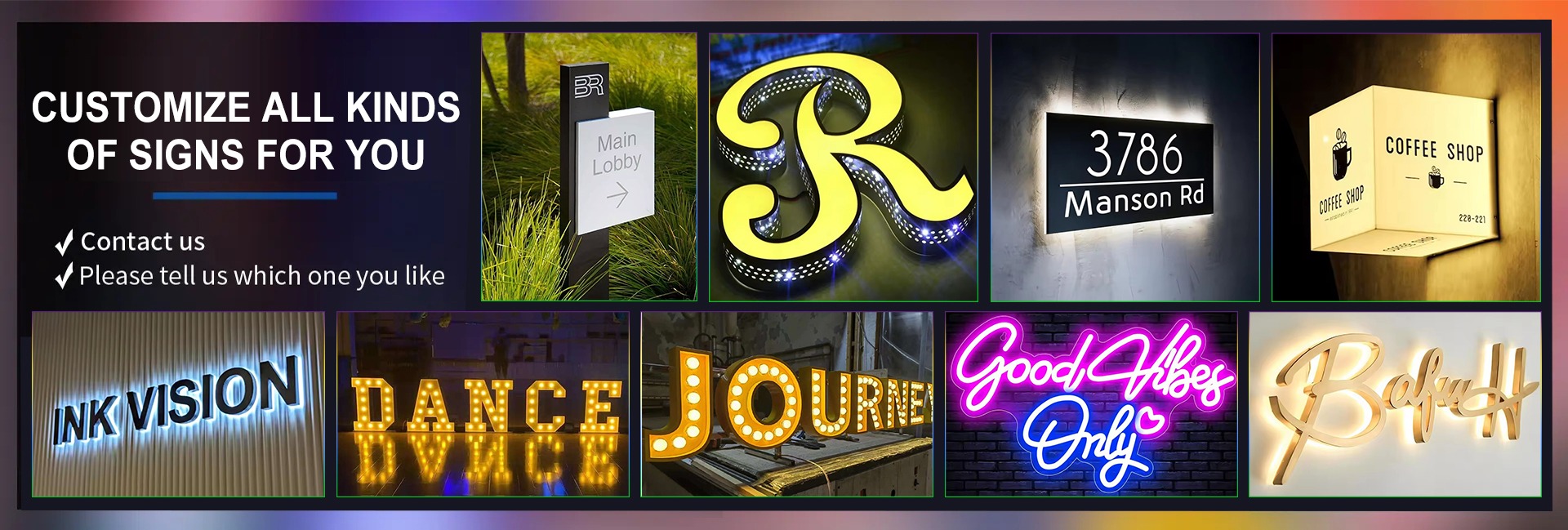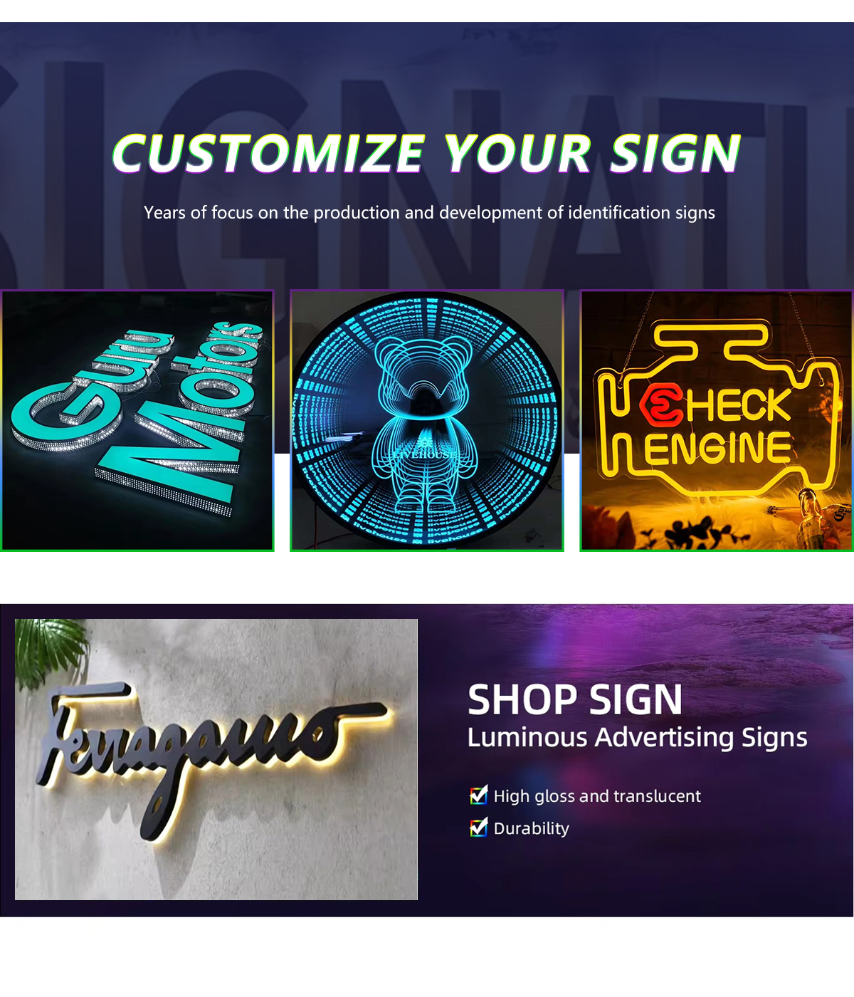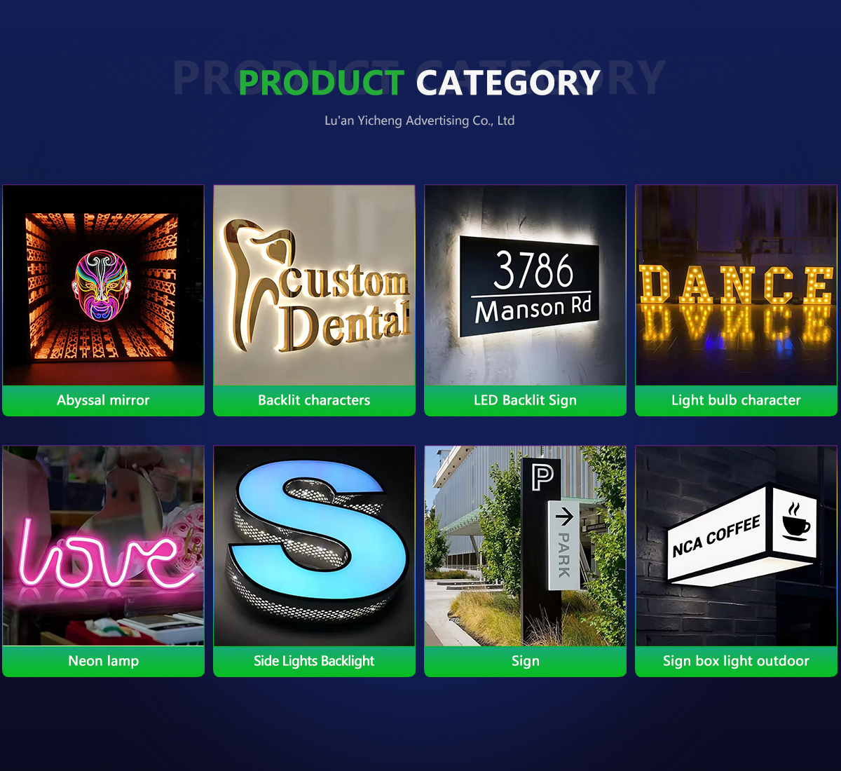 主な製品:看板、発光文字、ネオンランプ、ライトボックス、大規模看板